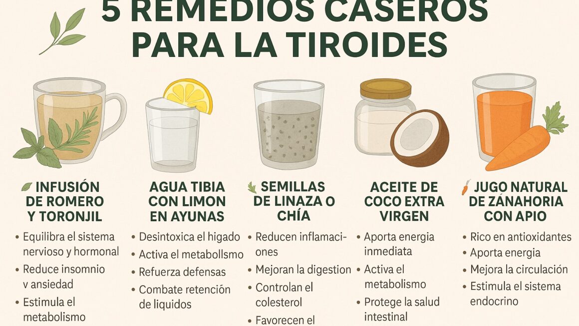 Aunque el tratamiento médico es la base para mantener la tiroides bajo control, la naturaleza ofrece aliados que pueden reforzar la salud de esta glándula. A continuación, conocerás 5 remedios caseros efectivos, con recetas prácticas, beneficios comprobados y propiedades que realmente ayudan al organismo.