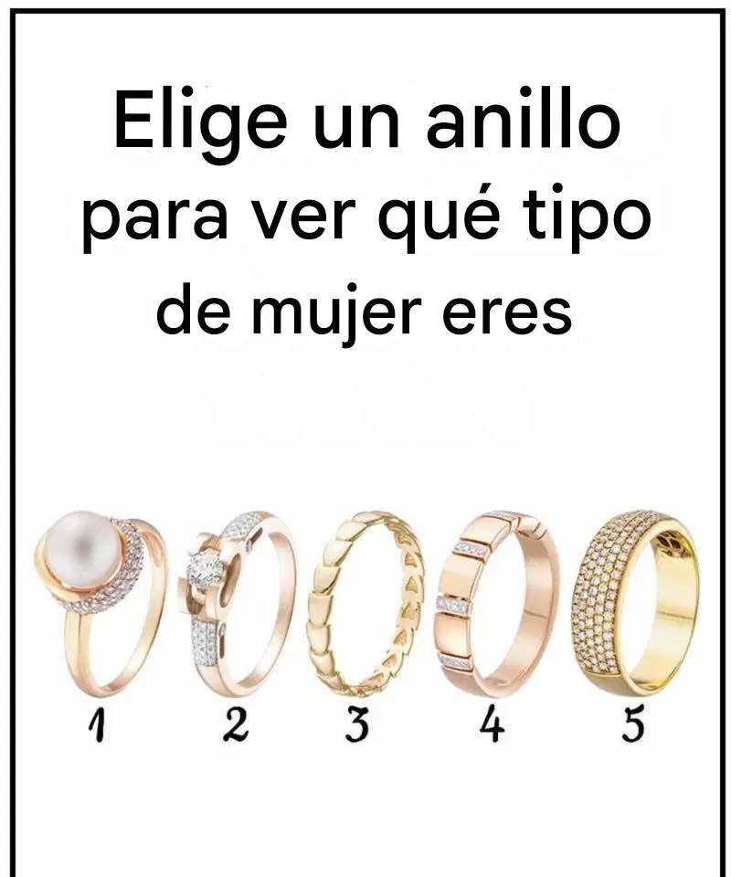 Observa los cinco anillos de la imagen de arriba y elige el que te refleje al instante. No lo pienses demasiado y elige el anillo que más te represente. Una vez que hayas elegido, lee la descripción a continuación para descubrir qué dice tu elección sobre el tipo de mujer que eres.